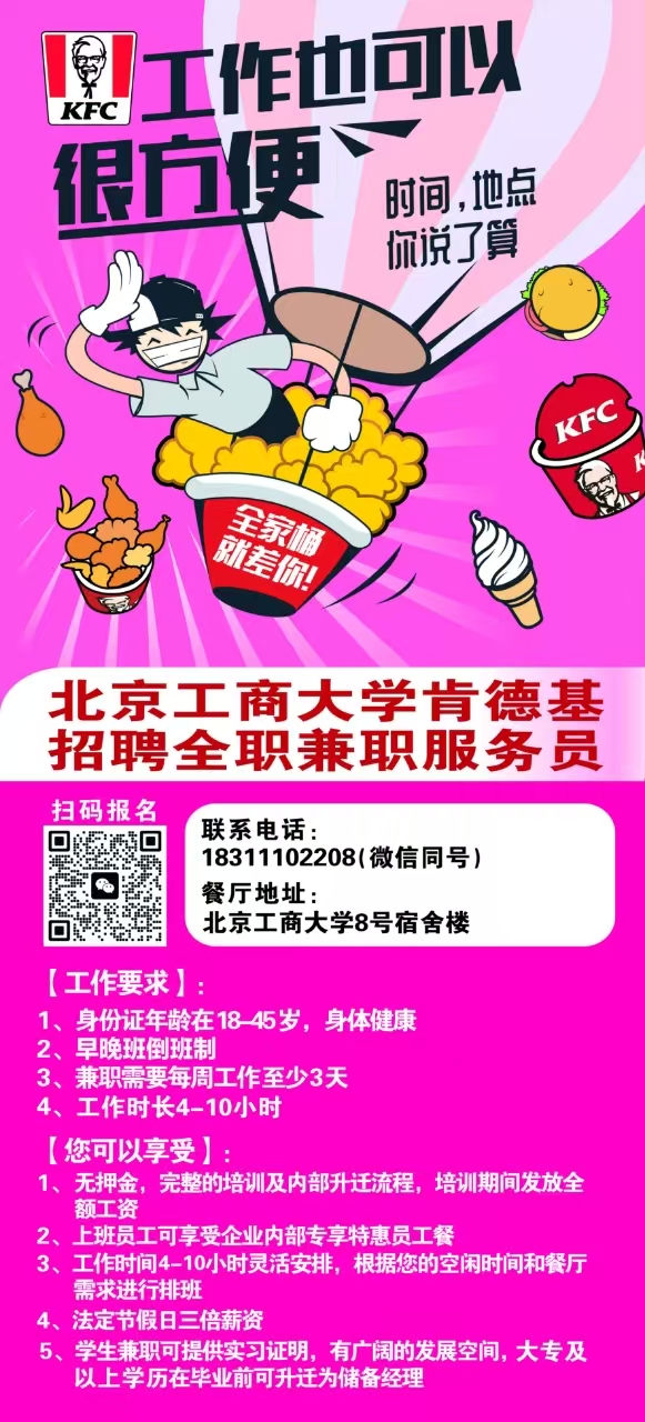 北京工商大学良乡校区内肯德基招募服务员啦!现招募3-5名员工和学历大专以上的值班经理。 工作地点:北京工商大学良乡校区内肯德基餐厅 工作内容:产品制作、销售、清洁等 工作要求:年龄在50岁以下,18岁以上 薪资待遇:20元一小时,早晚班补助,工时补助等