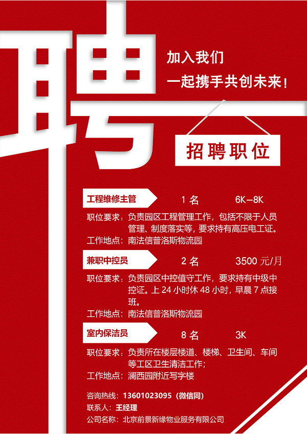 招聘:工程维修主管1名,兼职中控员2名,室内保洁员8名