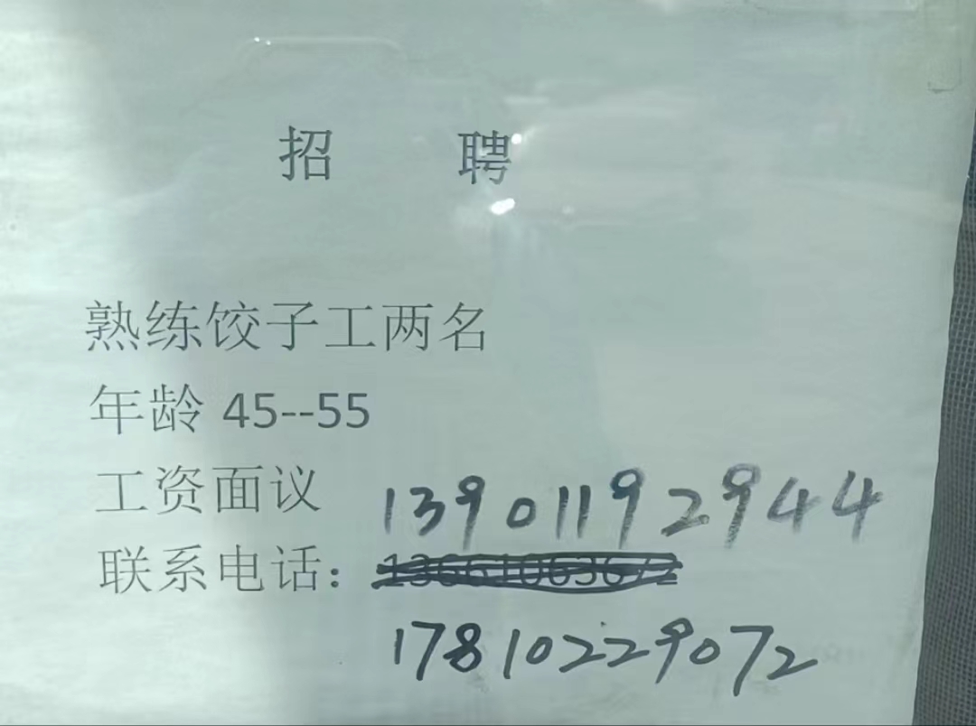 三家店饺子馆招熟练饺子工两名,工资面议