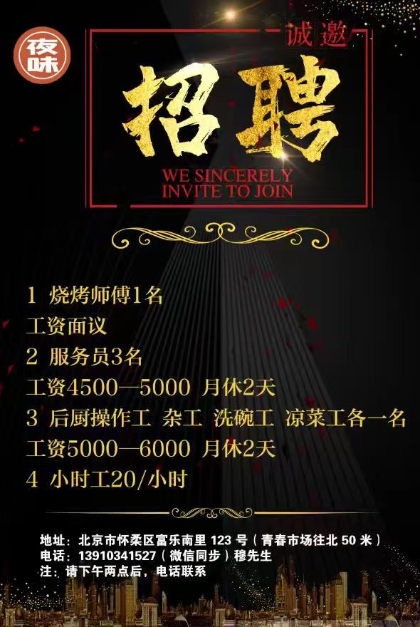 招聘 招烧烤师傅1名,工资面议,联系电话:13910341527穆先生