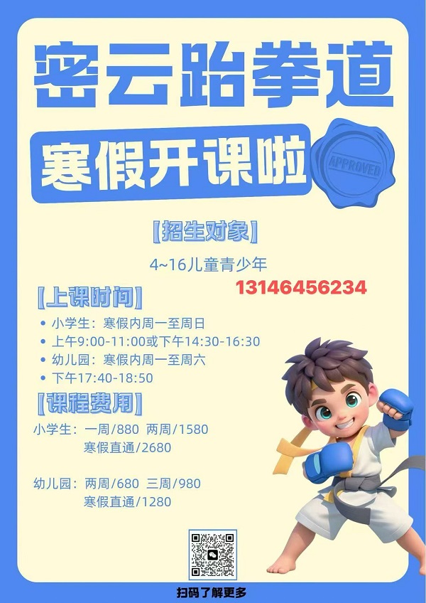 密云跆拳道 寒假开课啦 【上课时间】 【招生对象】4~16儿童青少年13146456234 ·小学生:寒假内周一至周日 。上午9:00-11:00或下午14:30-16:30 ·幼儿园:寒假内周一至周六 。下午17:40-18:50 【课程费用】 小学生:一周/880 两周/1580寒假直通/2680 幼儿园:两周/680 三周/980 寒假直通/1280 有意者扫码联系