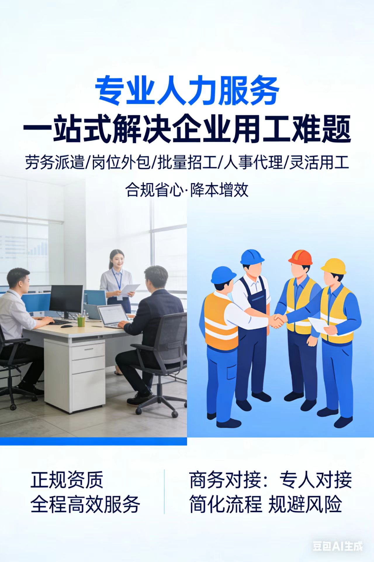 1. 我们是正规人力资源服务公司,拥有齐全资质,可承接企业劳务派遣、外包用工、批量招聘,帮助企业简化用工流程、降低成本、规避风险,欢迎各行业洽谈长期合作。 2. 专为企业解决:招工难、用工繁、成本高、风险大问题。提供劳务派遣、岗位外包、人员管理等一站式服务,专人对接,高效稳定。 3. 企业用工不用愁,我们提供: – 劳务派遣/岗位外包 – 批量快速招工 – 合规用工风险把控 一站式服务,省心、省钱、省力,期待与贵公司合作。 三、主打优势版(最吸引老板) 1. 企业用工选我们:省钱、省心、省人、合规,专业团队全程负责,合作灵活,长期稳定。 2. 降低企业用工成本,提升招聘效率,规范用工风险,一站式人力资源外包服务,欢迎合作。 联系电话: 18811382070 18516869995