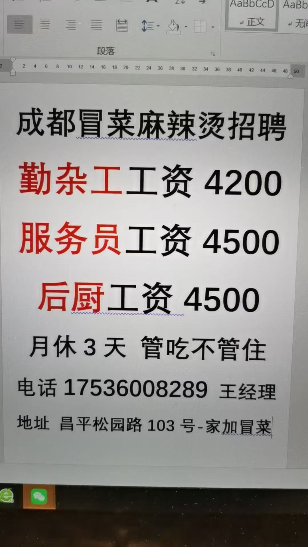 成都冒菜麻辣烫招聘勤杂工,工资4200,服务员工资4500 后厨工资4500,月休3天,管吃不管住,有意者电话联系王经理地址 昌平松园路103号-家加冒菜