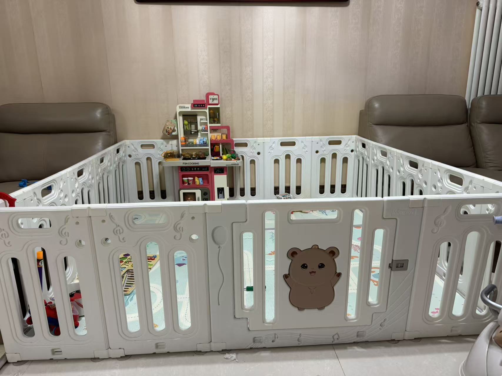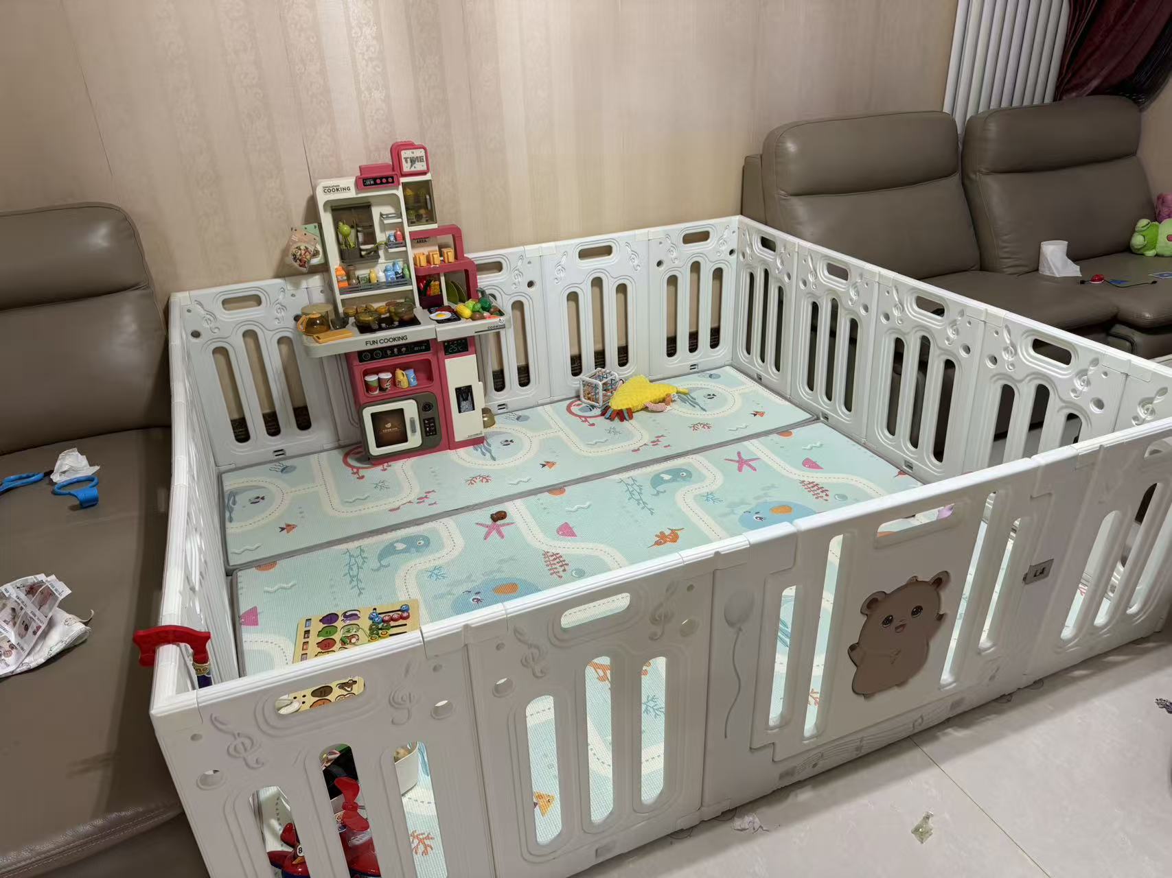 出一个儿童玩具厨房,所有功能完好可以抽水,100出 1.8✖️2m围栏,可变收纳柜200出,地址迎宾花园,还有一个婴儿床。电话13716757234微信h565702808